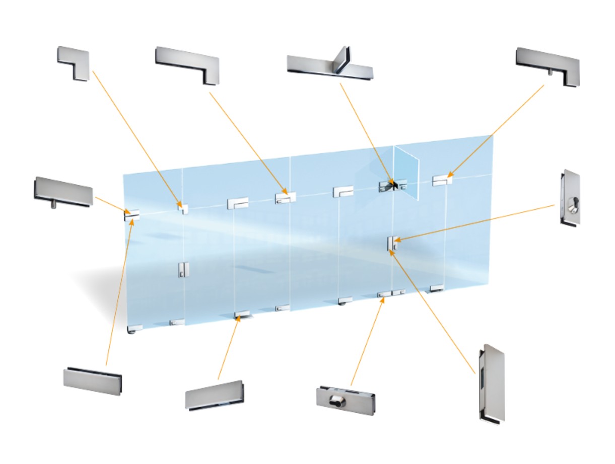 Das komplette System an hochwertigen Schlössern und Beschlägen für Ganzglasanlagen im Außenbereich bietet höchste Ansprüche an Funktionalität und Sicherheit im konstruktiven Glasbau.